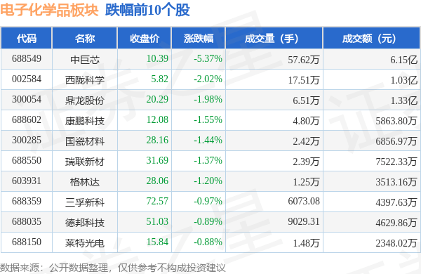 9月21日电子化学品板块较上一交易日下跌0.25%,中巨芯领跌。当日上证指数报收于3084.7,下跌0.77%。深证成指报收于9981.67,下跌0.9%。电子化学品板块个股涨跌见下表: