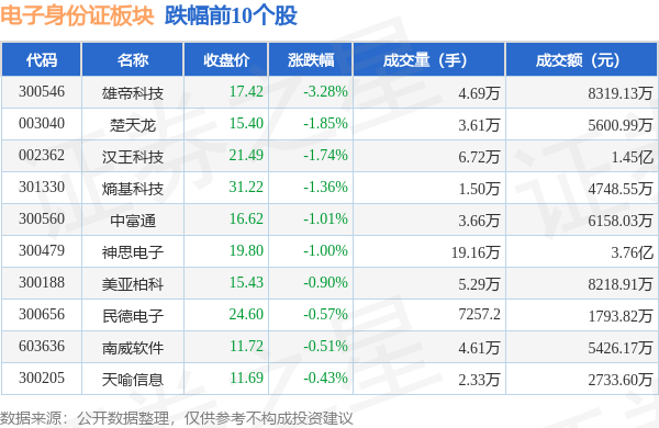 9月21日电子身份证板块较上一交易日下跌0.07%,雄帝科技领跌。当日上证指数报收于3084.7,下跌0.77%。深证成指报收于9981.67,下跌0.9%。电子身份证板块个股涨跌见下表: