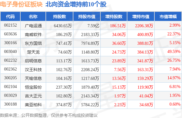 北向资金方面,当日电子身份证板块北向资金持股市值为16.91亿元,增持0.41亿元。其中增持最多的是广电运通,增持了0.22亿元。减持持最多的是科蓝软件,减持了59.99万元。电子身份证板块北向资金持股变动明细见下表: