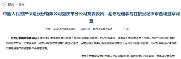 9月18日,中央纪委国家监管网站再次通报显示,人保财险重庆市分公司党委委员、副总经理李成柱涉嫌严重违纪违法,目前正接受纪律审查和监察调查。
