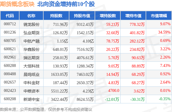 北向资金方面,当日期货概念板块北向资金持股市值为50.04亿元,减持604.43万元。其中增持最多的是锦龙股份,增持了778.32万元。减持持最多的是物产中大,减持了572.53万元。期货概念板块北向资金持股变动明细见下表: