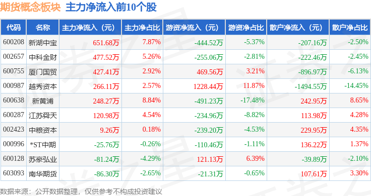 从资金流向上来看,当日期货概念板块主力资金净流出1.07亿元,游资资金净流出1018.69万元,散户资金净流入1.17亿元。期货概念板块个股资金流向见下表: