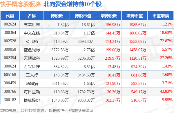 北向资金方面,当日快手概念股板块北向资金持股市值为44.34亿元,增持1.06亿元。其中增持最多的是完美世界,增持了0.2亿元。减持持最多的是利欧股份,减持了0.12亿元。快手概念股板块北向资金持股变动明细见下表: