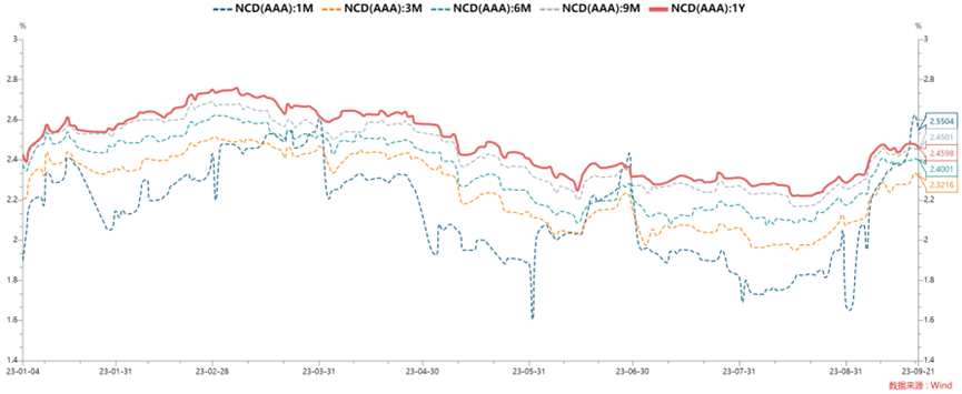 国有和主要股份制银行一年期同业存单一级最新报价集中在2.45%和2.46%附近,并伴有一定需求;同期限存单二级最新成交在2.45%附近,较上日下行2bp。