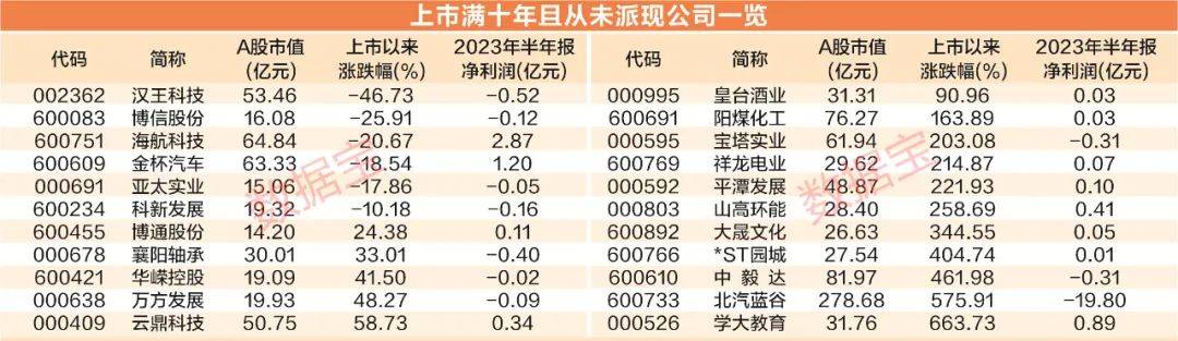 数据宝统计,A股历史上,上市时间在十年以上,且从未实施派现的公司有22家。这22家公司上市以来净利润均没有实现持续盈利,其中非国有企业占比超过半数。