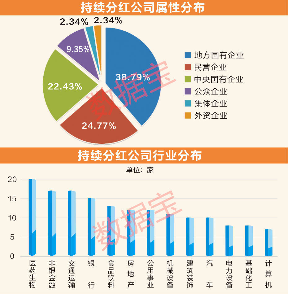 二、国企表率作用明显。在持续分红的上市公司群体中,国资企业占据最大比例。数据宝统计,中央国有企业、地方国有企业分别有48家、83家入围,合计占比达到61.21%。而整个A股市场上,国资企业合计1385家,占A股公司总数的比例为26.23%。国资上市公司持续分红的比例远高于其在A股整体占比,表率作用显著。