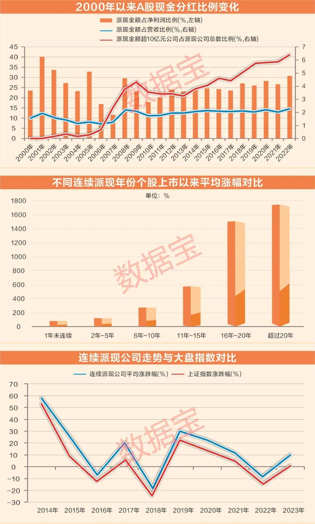 数据宝统计,从2023年往前按年类推,连续派现超20年的公司上市以来平均涨幅17.5倍,排在第一位;2023年有派现但未连续的公司涨幅最低,上市以来平均涨幅仅75.4%。