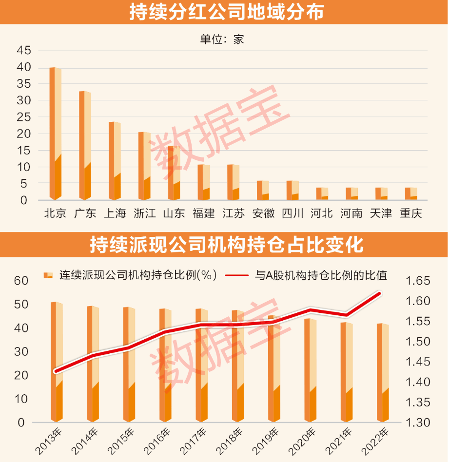 五、机构抱团比例高。持续分红公司本就稀缺,加上高回报率,更容易受到机构投资者的青睐。数据宝统计,2022年,上述214家公司整体机构持仓占流通股比例为42.45%,是同期A股机构持仓占流通股比例的1.62倍,这一比值创下十年来新高。