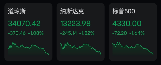 截至收盘,道指跌1.08%报34070.42点,标普500指数跌1.64%报4330点,纳指跌1.82%报13223.99点。