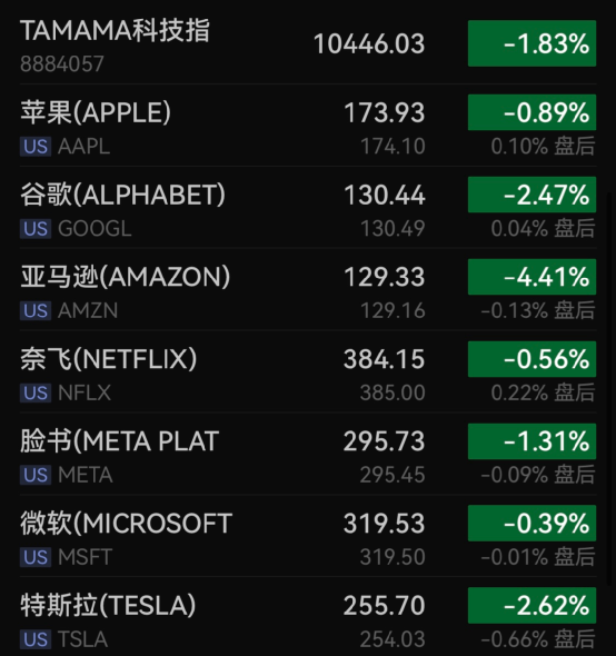 科技股集体下跌,万得美国TAMAMA科技指数跌1.83%,亚马逊跌4.41%,特斯拉跌2.62%,苹果跌0.89%,奈飞跌0.56%,谷歌跌2.47%,脸书跌1.31%,微软跌0.39%。