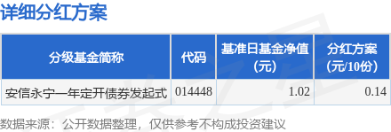9月22日发布《安信永宁一年定期开放债券型发起式证券投资基金2023年第二次分红公告》。本次分红为2023年第二次分红。公告显示,本次分红的收益分配基准日为9月9日,详细分红方案如下: