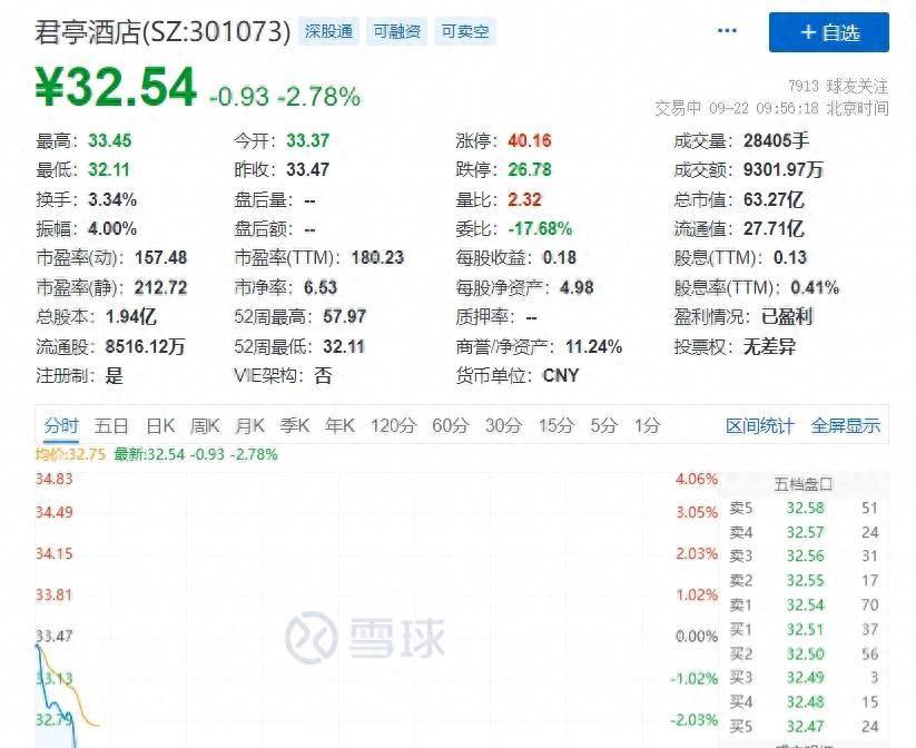 乐居财经 李兰9月22日,A股酒店餐饮板块持续低迷,截至9:56,君亭酒店跌2.78%,报32.54元,总市值为63.27亿元。