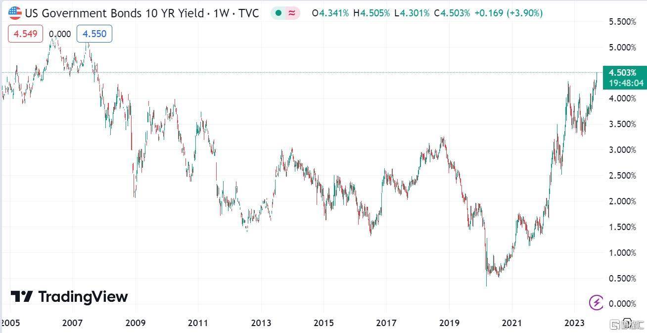 与此同时,美联储“鹰派加息”,美国国债利率狂飙,10年期美债收益率升至4.5%,为2007年以来首次;2年期国债的收益率也达到了5.2%的17年高点。