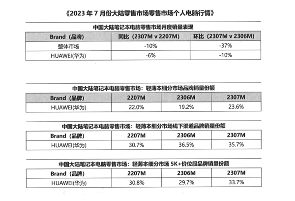 【CNMO新闻】近日,市场咨询公司GFK公布了2023年7月份笔记本零售市场报告。报告显示,7月份中国大陆笔记本电脑零售市场季度销量同比下降10%,环比下降37%。在轻薄本电脑细分零售市场中,华为品牌份额为23.6%,同比增长1.6%,环比增长4.4%。其中在轻薄本线下渠道中份额为35.7%,同比增长5.0%,另外在轻薄本5K+价位段份额为 33.7%,同比增长2.9%,环比增长4.0%。从机构公布的数据来看,华为或将成为轻薄本市场份额第一,展现出了其在智慧PC赛道上遥遥领先的实力。