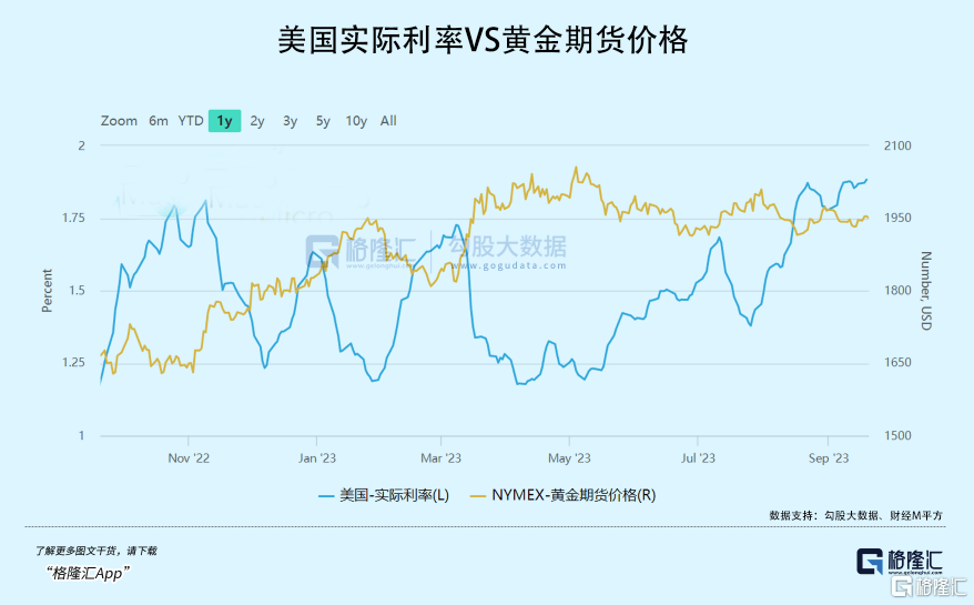今年5月,纽约金主力期货价格一度去到2085美元/盎司,后不断回落,目前仅有1949美元/盎司,整体跌幅超过5%。如果从年初统计至今,仍然录得正收益,为6.5%。