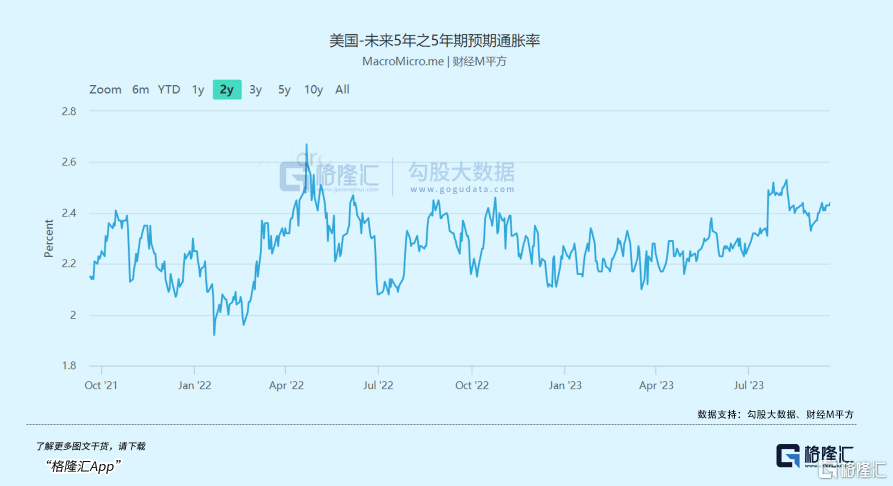 第二,通胀预期,会怎么样?我们以未来5年预期通胀率来代替。目前,该指标为2.43%,较5月小幅提升。整体看,该指标处于2%以上的相对良性区间。这也意味着市场目前认为未来5年美国通胀还是会大幅回落至正常区间。当然,这也有可能会随着时间的变化而得以修正。
