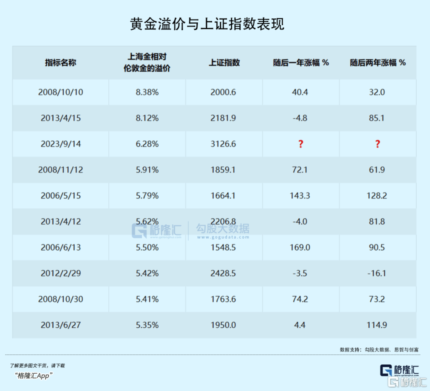 以史为鉴,金价溢价现象之后的1年或2年内,沪指大多录得非常可观的涨幅。