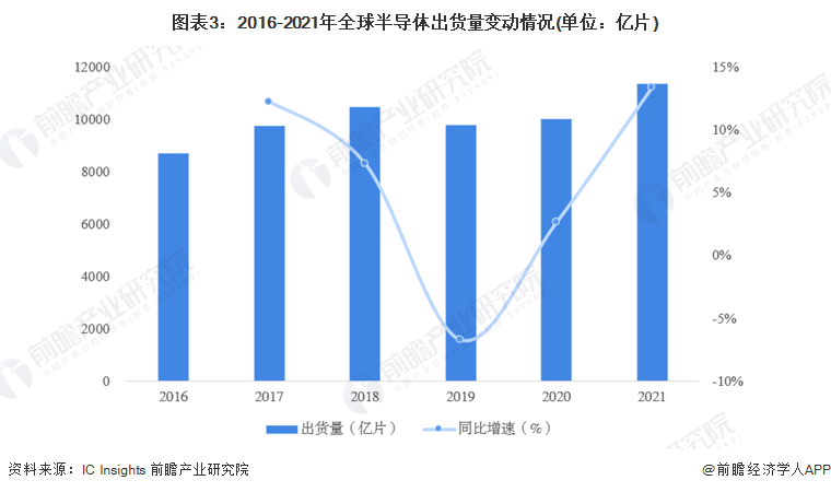 根据IC Insights统计数据,2016-2021年全球半导体出货量呈现上升趋势,2021年全球半导体出货量达到1.14万亿片,同比上升13.36%。