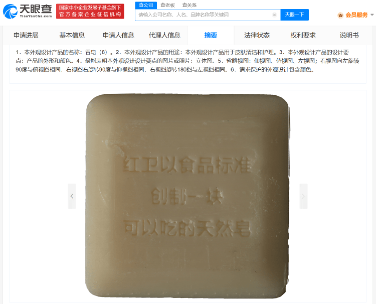 此外,该公司已获得多项产品专利授权,其中多项“香皂”外观专利附图显示,其产品印有“红卫以食品标准创制一块可以吃的天然皂”字样。