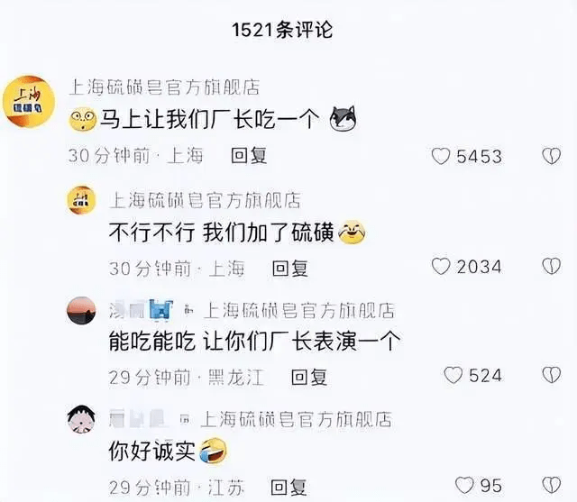 随后,知名国货品牌上海硫磺皂官方账号下,有网友留言称,让自家厂长也吃一个。