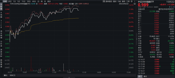 截至2023年9月22日13:19,中证2000指数ETF(159532)上涨势头延续,现涨1.12%,换手率11.23%,资金持续关注,市场交投活跃。