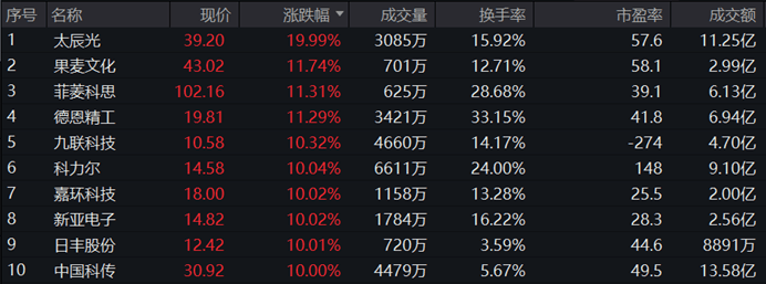 指数成份股中,截至2023年9月22日13:19,太辰光涨停,果麦文化上涨11.74%,菲菱科思上涨11.31%,德恩精工上涨11.29%,科力尔、嘉环科技等多股涨停。