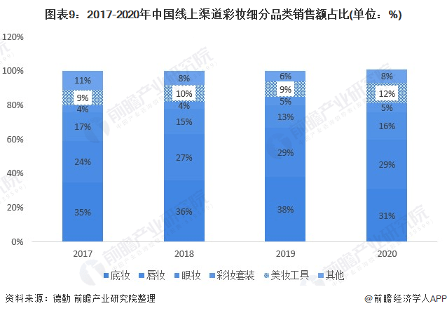 从品类来看,底妆是我国彩妆线上渠道销售额占比最高的细分品类,其次是唇妆。此外,两者的线上渠道销售额占比呈现逐年增长的态势。2020年,底妆和唇妆线上渠道销售额占彩妆线上总销售额的38%和29%。美妆工具销售额占比为12%,市场份额进一步扩大。