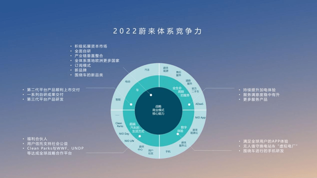 蔚来汽车联合创始人、总裁秦力洪曾向媒体展示了一张有关2022蔚来体系竞争力的PPT,“内圈是底层的芯片和架构级别的,中间是系统软件级别的,外面是应用级别的。”