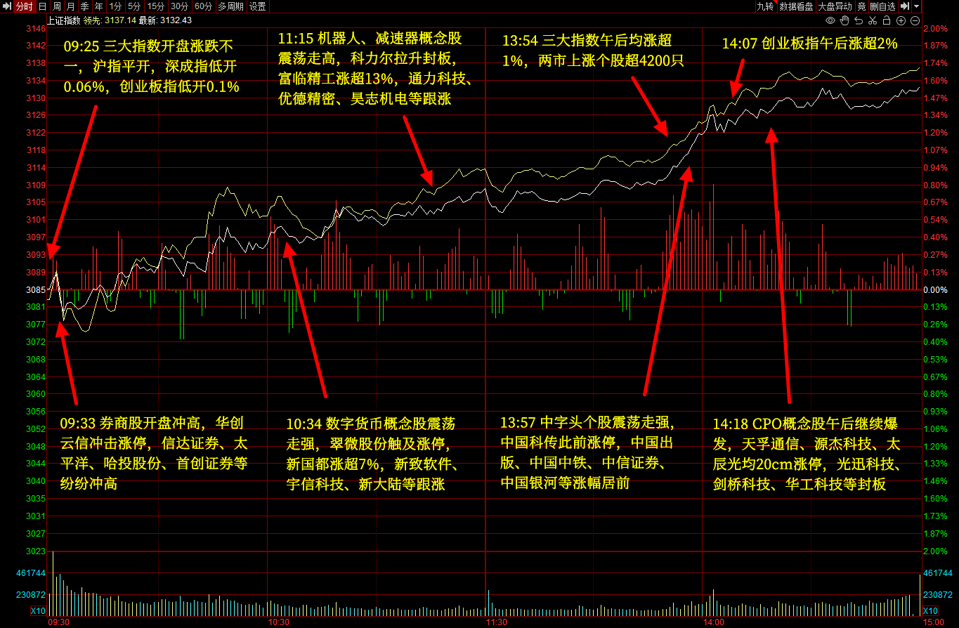 三大指数今日放量反弹,沪指午后涨超1%,重返3100点上方,创业板指涨超2%。AI概念股全线爆发,CPO、算力等方向领涨,源杰科技、菲菱科思、天孚通信、太辰光、昆仑万维20cm涨停,光迅科技、剑桥科技、华工科技、中贝通信等十余股封板,中际旭创、新易盛、博创科技、万兴科技等多股涨超10%。券商股也集体拉升,华创云信涨停,指南针涨超8%。个股呈现普涨态势,两市超4400股飘红,今日成交7655亿元。