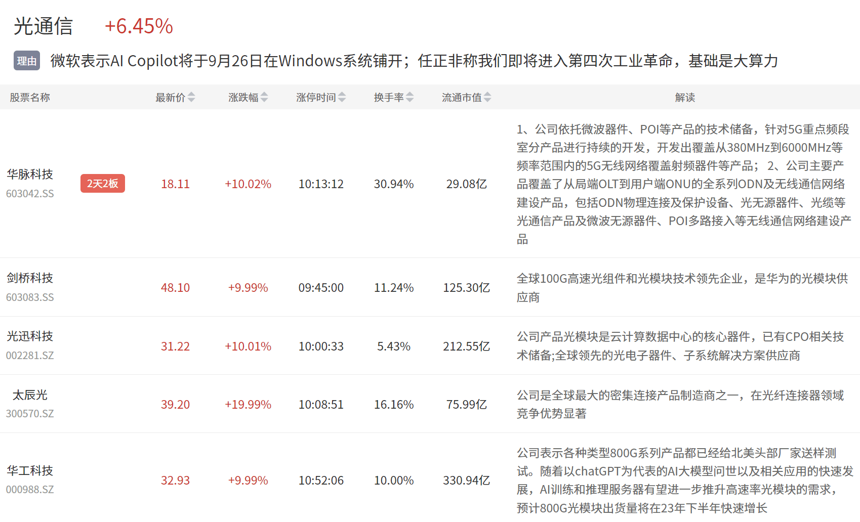 光通信板块今日大涨,华脉科技、剑桥科技、华工科技等多股涨停。