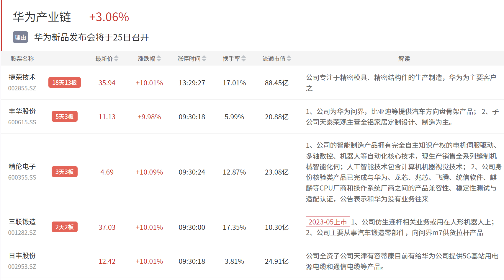 华为产业链今日继续走强,捷荣技术、丰华股份涨停,华为机器人盘中异动,科力尔涨停,安联锐视、九联科技等涨幅均超10%。
