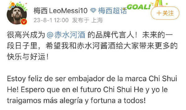 事实上,早在今年8月初,赤水河酒与梅西就分别在各自平台发布了合作信息。据彼时部分财经媒体报道,梅西授权给赤水河酒的代言权限为使用肖像权,费用超过2000万元/年。