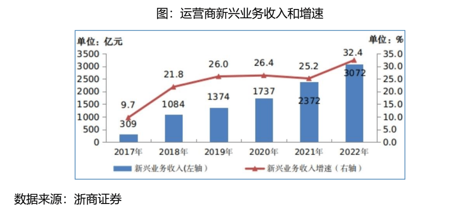 开源:创新业务为运营商贡献新引擎。随着数据中心、云计算、大数据、物联网等新兴业务的快速发展,运营商新兴业务收入增长突出。2022年共完成业务收入3072亿元,比上年增长32.4%,在电信业务收入中占比由上年的16.1%提升至19.4%。其中,数据中心、云计算、大数据、物联网业务比上年分别增长11.5%、118.2%、58%和24.7%。运营商处于“数字化、网络化、智能化”的中间环节,运营商在电信产业链中扮演着举足轻重的地位。三大运营商为实现数字价值的最大红利,面向数字经济新蓝海,电信运营商正在成为数字经济国家队,在国家网络安全、自主可控等领域发挥重大作用。