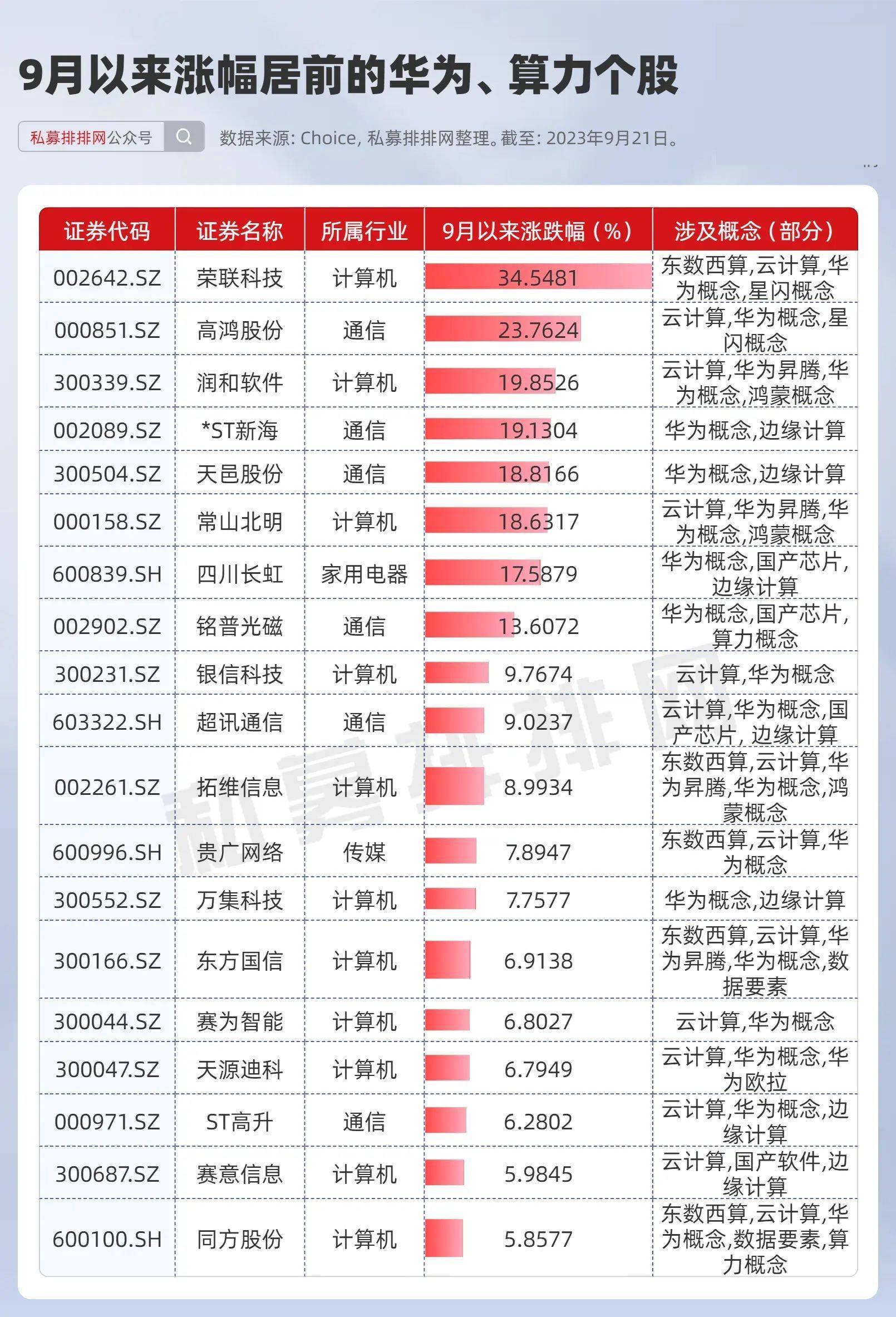 笔者梳理了同时涉及华为概念和东数西算、云计算等概念的个股,发现9月以来已有多只涨幅超10%,其中涨幅前二十名单笔者整理如下,多只个股直接涉及华为昇腾概念。