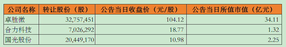 如按公告当日收盘价,卓胜微、合力科技、国光股份所转让的股权所值市值分别为34.11亿、1.32亿及2.25亿。