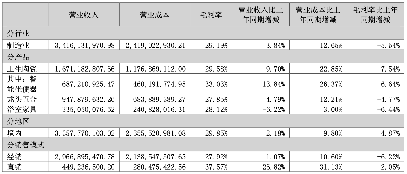 中报显示,今年上半年,箭牌家居卫生陶瓷实现收入约16.71亿元,同比增长9.70%,毛利率同比下降7.54个百分点至29.58%;龙头五金实现收入约9.48亿元,同比增长4.79%,毛利率同比下降4.77个百分点至27.85%;浴室家具实现收入约3.35亿元,同比下降6.22%,毛利率同比下降6.44个百分点至28.12%。