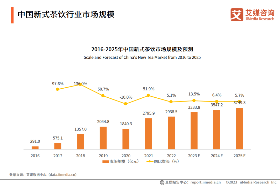 据艾媒咨询发布的《2023—2024年中国新式茶饮行业运行状况与消费趋势调查分析报告》显示,得益于互联网技术的迭代和网络支付技术的完善,2022年中国新式茶饮市场规模为2938.5亿元。未来伴随着新式茶饮消费场景更加多元化,品类不断创新拓宽,消费者对新式茶饮的热情持续上升,预计2025年中国新式茶饮市场规模达到3749.3亿元。