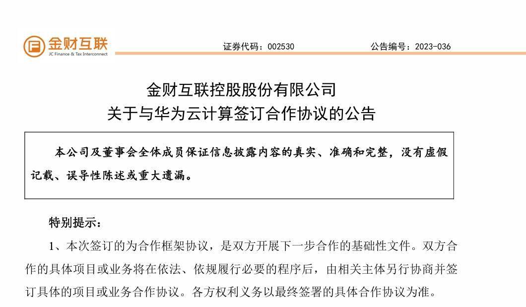 鞭牛士 9月22日消息,金财互联发布公告称,其控股公司金财数据与华为云计算签署了《合作框架协议》,双方拟在企业数智化、尤其在财税数智化领域,依托人工智能、云计算、数据孪生、区块链等技术,同时借助行业垂直领域模型及大模型,在实现企业经营智能化决策与运营,推动企业管理模式和业务运营重构等方面进行交流与合作。
