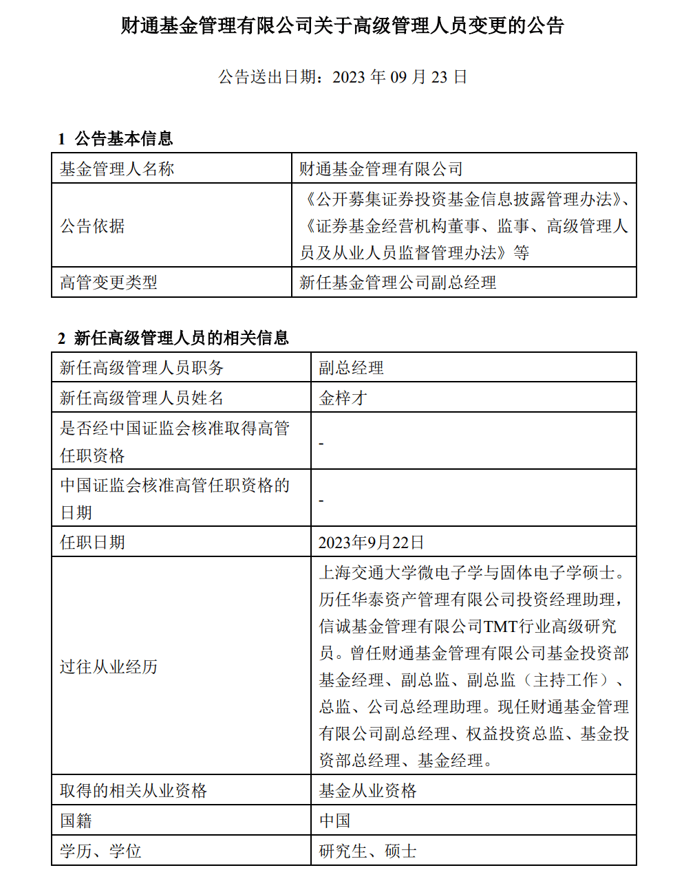 金梓才新任财通基金副总经理
