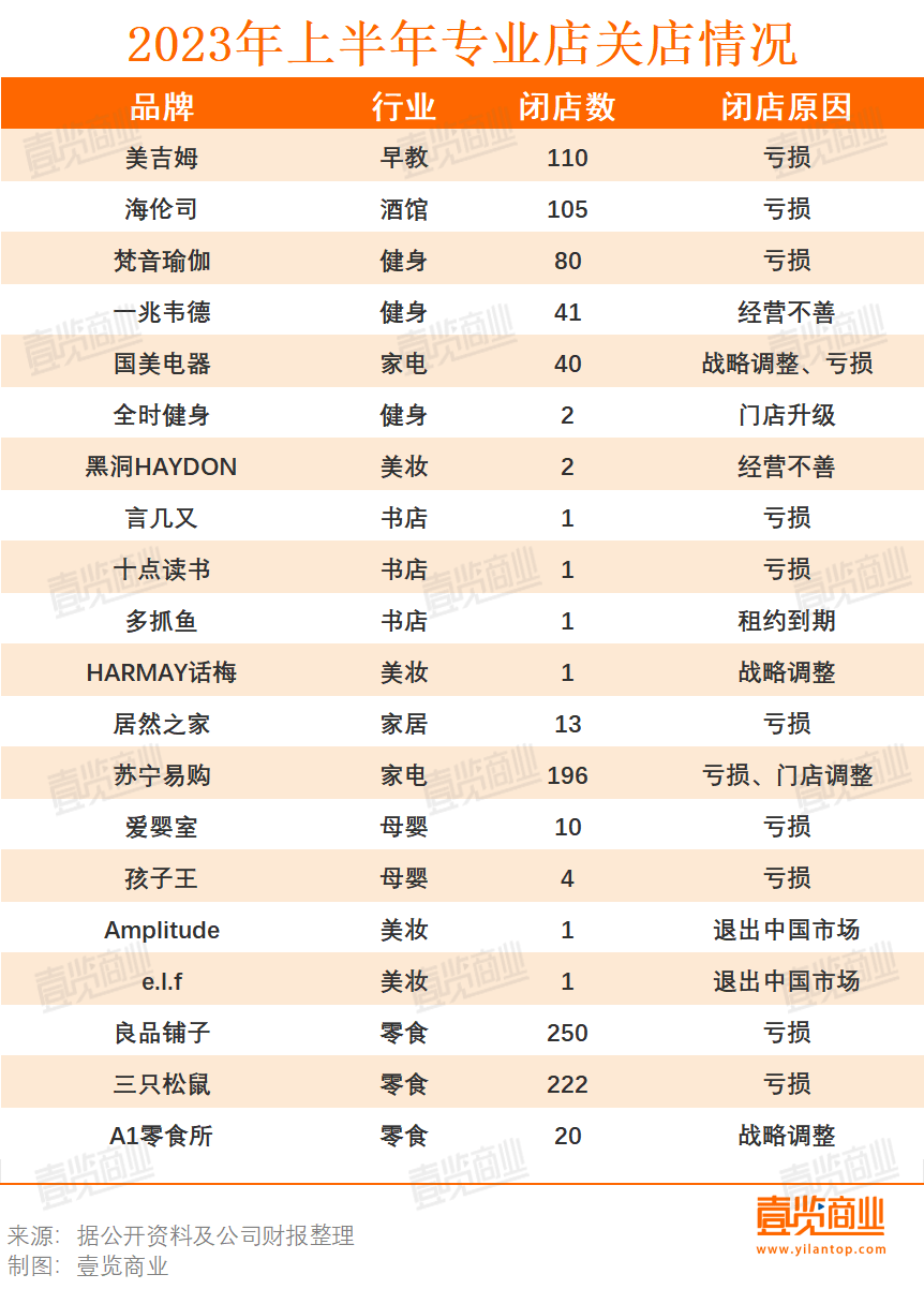 根据2023年上半年国家统计局数据,上半年专业店零售额同比增长为4.5%,整体呈缓慢增长趋势,但由于自身发展问题,部分行业门店2023年上半年迎来大幅关店。