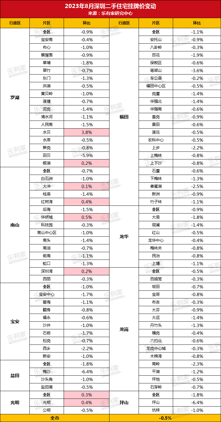 据乐有家研究中心监测,8月业主心态走低,片区挂牌价大面积下跌。全市挂牌均价环比再跌0.5%,已经连续2年下滑。除了7个片区的价格能维稳止跌,剩余片区挂牌价均是持续下行,跌幅多在1%-2%。看似只是微量的下调,但每月持续减少,长期积累下来业主报价已经有较大的降幅。