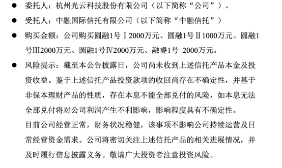 此后,光云科技分别于今年4月26日、5月26日、6月28日、7月7日、7月14日、4月26日购买了中融信托发行的5只信托产品,其中4只产品投资额2000万元,1只产品投资额1000万元,合计9000万元。