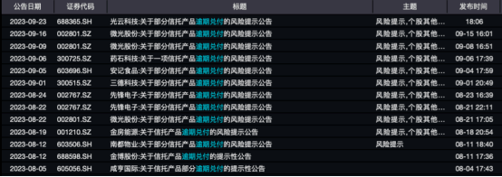 其中涉及金额较大的微光股份,8月以来已先后3次发布逾期兑付风险。9月15日公告显示,公司购买的今年9月11日至9月15日到期的4只中融信托产品逾期未能兑付,合计金额2.3亿元。这些产品的预期年化收益率在5.4%至6.3%之间。