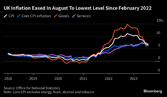 周三公布的数据显示通胀回落幅度超过了英国央行预期。8月份消费者价格指数同比上涨6.7%,远低于央行和经济学家预计的7%或更高。
