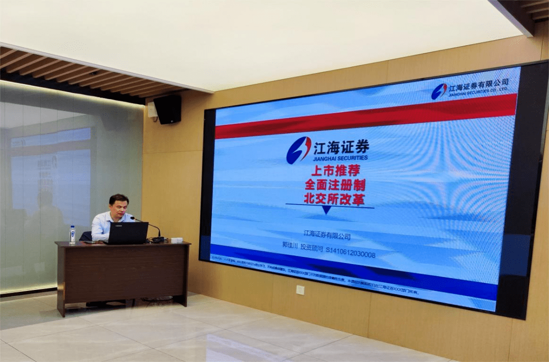 此次培训主要针对辖区优质企业开展,由江海证券首席投资顾问郭佳川进行授课,帮助优质企业学习了解企业上市融资的政策新规、上市流程与标准、全面注册制和北交所改革等,明晰企业上市融资的有关具体事项,为企业统筹谋划上市工作提供了遵循和指南。
