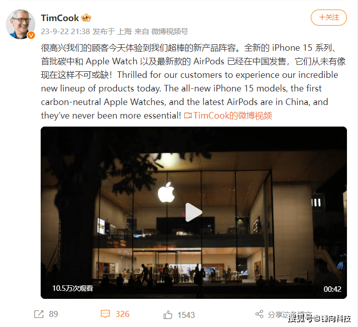 有意思的是苹果现当家人库克在9月22日21点38分,还特意在微博上发文点评了iPhone 15系列在国内的开售。他表示:“很高兴我们的顾客今天体验到我们超棒的新产品阵容。全新的 iPhone 15 系列、首批碳中和 Apple Watch 以及最新款的 AirPods 已经在中国发售,它们从未有像现在这样不可或缺!”