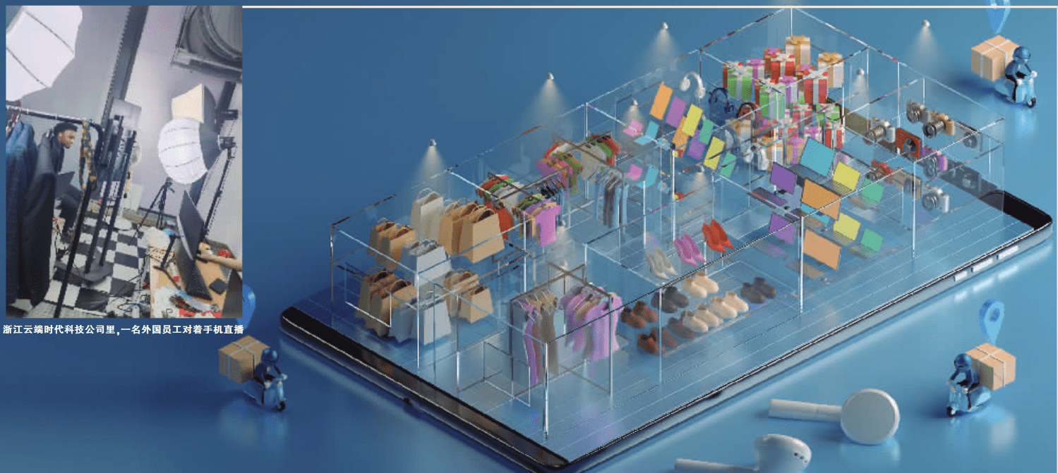 仲夏时分,记者来到杨帆公司总部,偌大的办公室一隅,设有一间小小的摄影棚。一名外国员工正对着手机直播,展示男装。