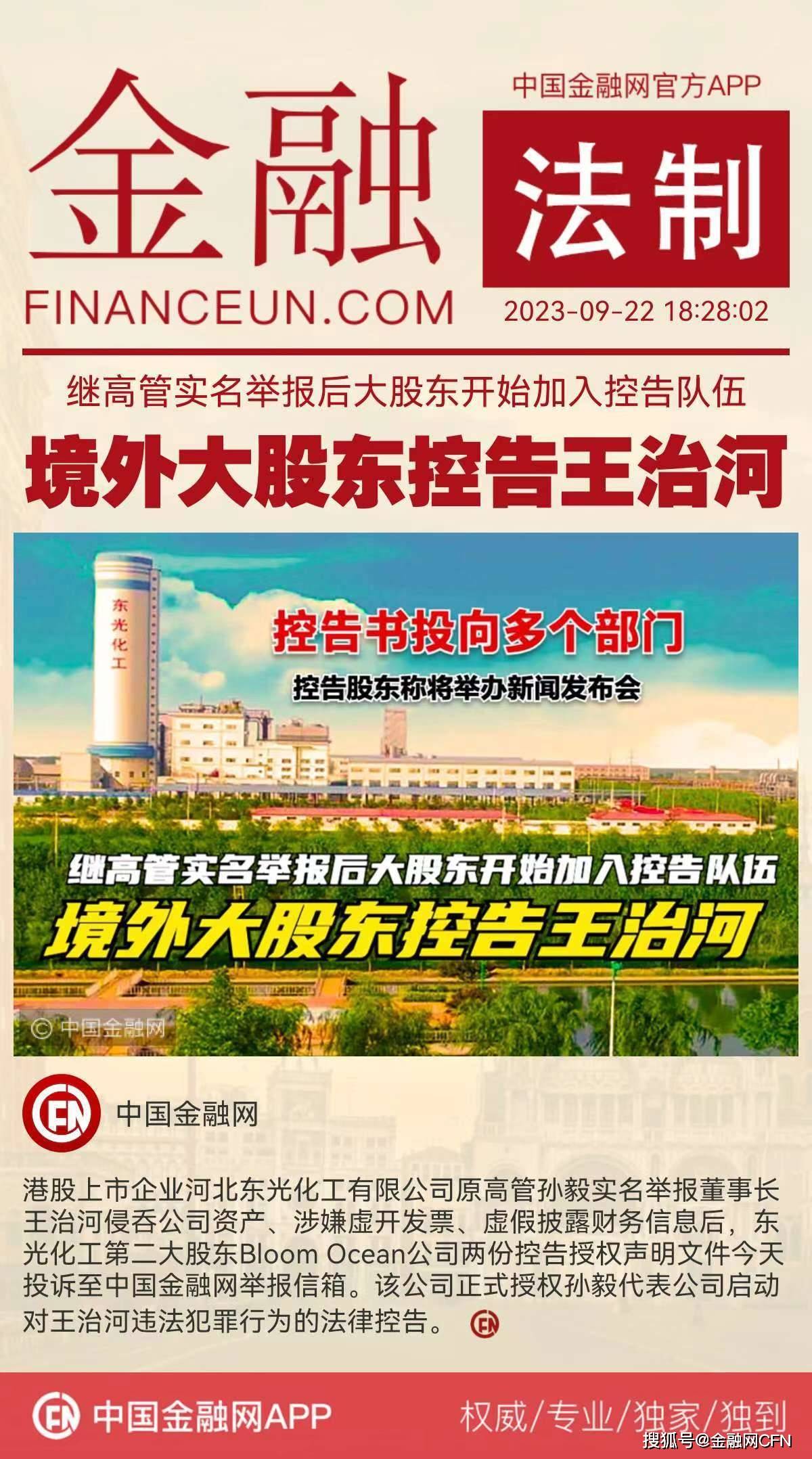 继中国金融网2023年9月1日刊发出港股上市企业河北东光化工有限公司原高管孙毅实名举报董事长王治河侵呑公司资产、涉嫌虚开发票、虚假披露财务信息后,引起业界极大反响。9月22日,中国金融网举报信箱再次收到东光化工第二大股东Bloom Ocean公司两份控告授权声明文件。Bloom Ocean公司的控告文件名称为《关于东光化工有限责任公司董事长王治河侵吞公司资产、损害股东利益等严重犯罪的控告书》,并正式授权孙毅代表公司启动对王治河违法犯罪行为的法律控告。