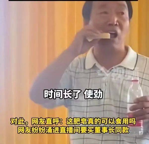 在直播中,红卫董事长一边说着:“里面没有任何有害的东西,你看。”然后拿起肥皂开始咬,“呀,这个干了咬不动。”随后对着肥皂又咬了一口,然后就着矿泉水喝下。