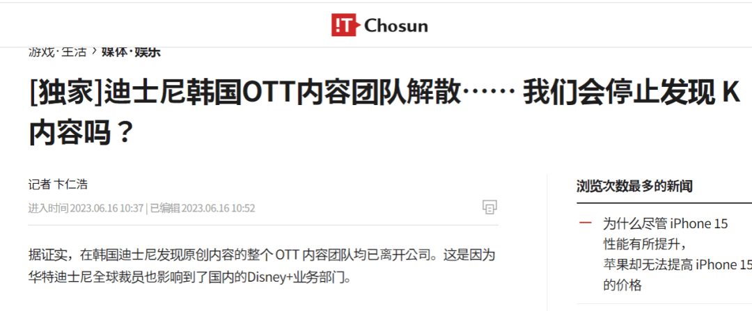 迪士尼韩国今年6月份就解散了内容团队。据韩媒it-Chosun报道,“15日,据业内人士透露,负责为迪士尼OTT“Disney Plus”发掘原创内容的迪士尼韩国OTT内容团队的15名成员已离职。业内也有传言称,Disney+的国内原创内容制作工作已暂时搁置。”